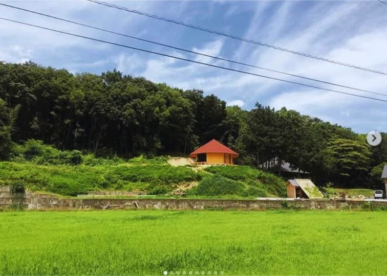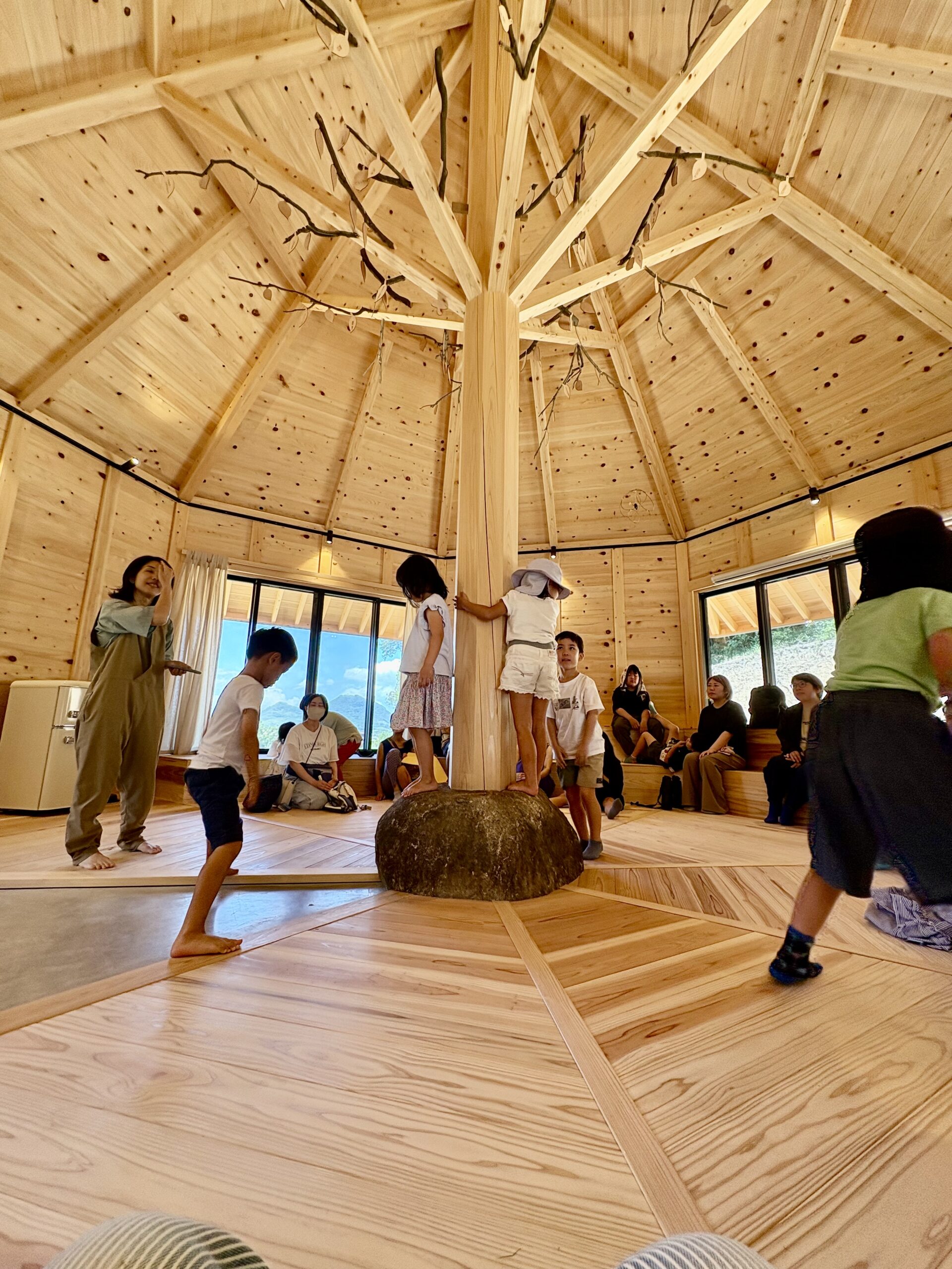 見晴らしのいい丘の上に、香川県産のヒノキと杉で八角堂の校舎が建ちました。入ると濃厚なヒノキの香りに出迎えられ、真ん中に巨木から切り出した大黒柱があり、入口は土間の床になっています。仰ぎ見ると、天井に伸びた枝にはクラウドファンディングで寄付して下さった方々の名前が刻まれた、沢山の葉っぱが見えます。職人さんの技術に直に触れることが出来る贅沢な空間です。そして、暑い夏もここで涼しく休憩できます。